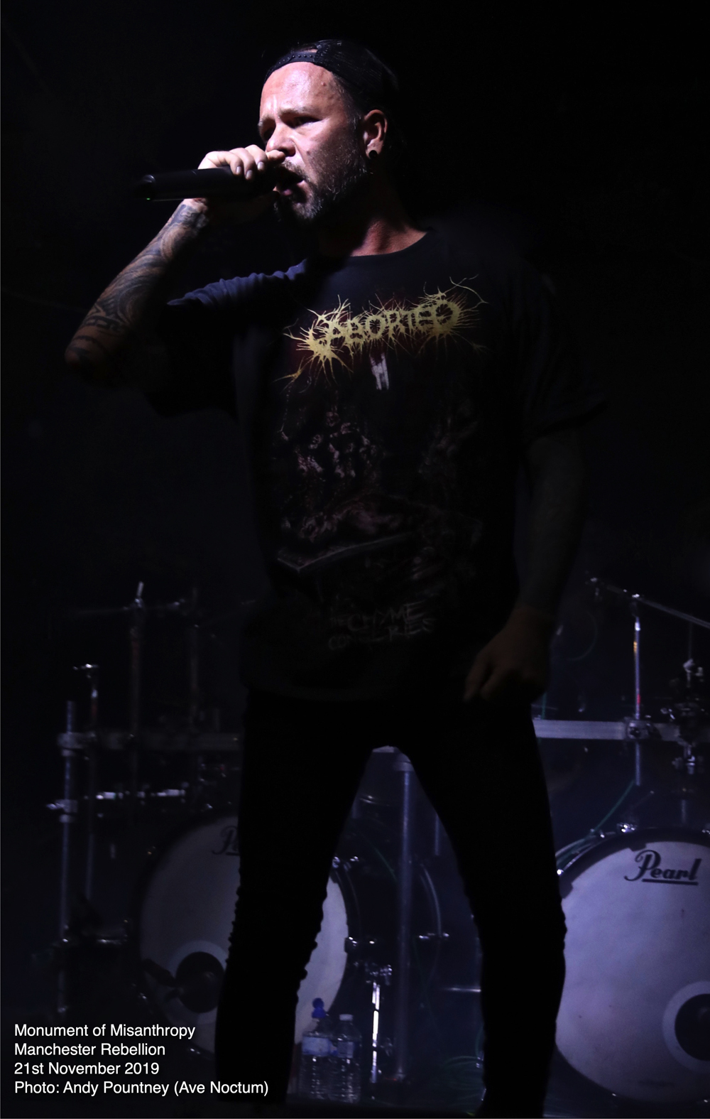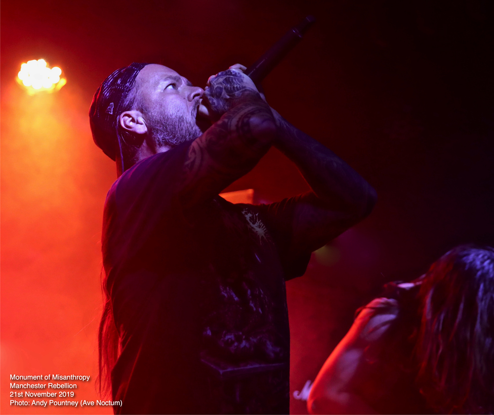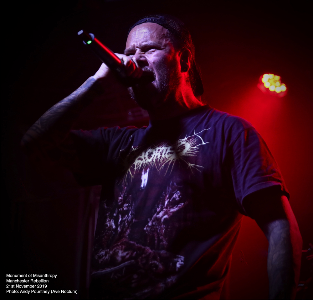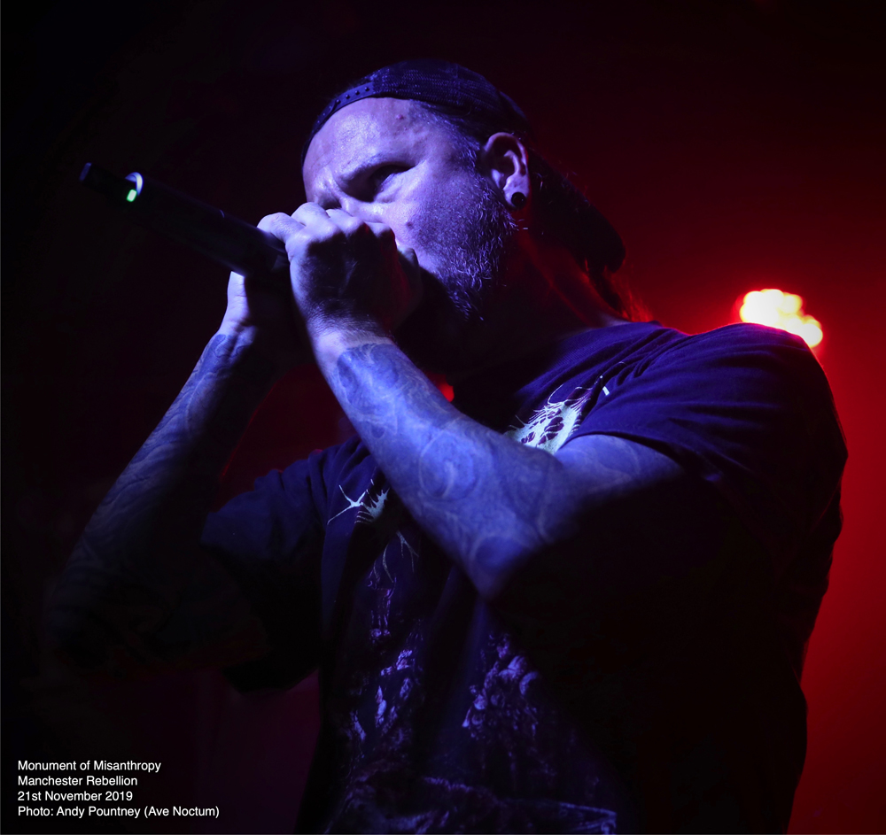 Contrasting with the melodic strains of Embryo was brutal slammers Monument Of Misanthropy whose line-up consisted of members from Austria, France and the UK if I heard the vocalist correctly. No matter where they were from the increased in power and brutality was massive as they strode on stage amidst the dramatic intro piece and blasted into “Vegan Homicide” timed in by two snare taps, a feature that was present for all their songs. As the surge in intensity unfolded the band floored the audience with “Malformation” as I felt the guitar sound was a tad suffocated by the bulldozing bass and drums but as my ears adjusted to the mix I could hear it fully as they aired a new track, weirdly titled “Mysterious Hollywood Hat-Trick”, complete with its 4 snare taps start signalling the detonation, as this song was utterly ferocious. “Bring Me The Head Of LGG” continued to maim the crowd as the blast beat was insanely fast but when the band injected their piercing riff breaks that is what made their set incredibly intense. Playing the Morbid Angel cover of “Fall From Grace” was dutifully honoured and played flawlessly and will always hook in an audience but their own material was sufficient for that purpose as another excellent new song pulverised us called “Tales From The Vienna Woods”, a song about an Austrian serial killer which I’m assuming is Jack Unterweger. The tempo dynamics here were excellent swerving the track from speed workouts to more melodic strains as they closed with their namesake tune “Monument Of Misanthropy”, whereby I took the opportunity to find a seat whilst their remorseless sonic annihilation continued.