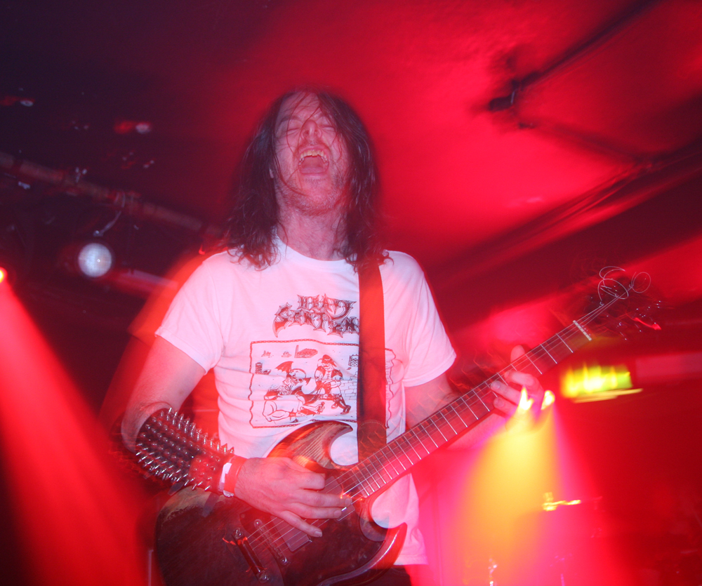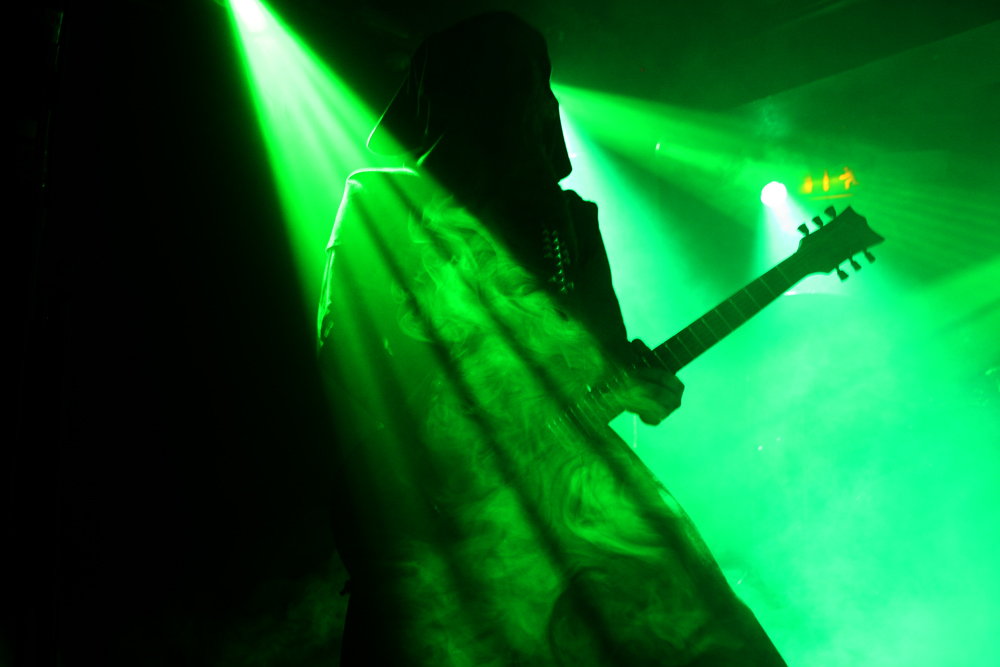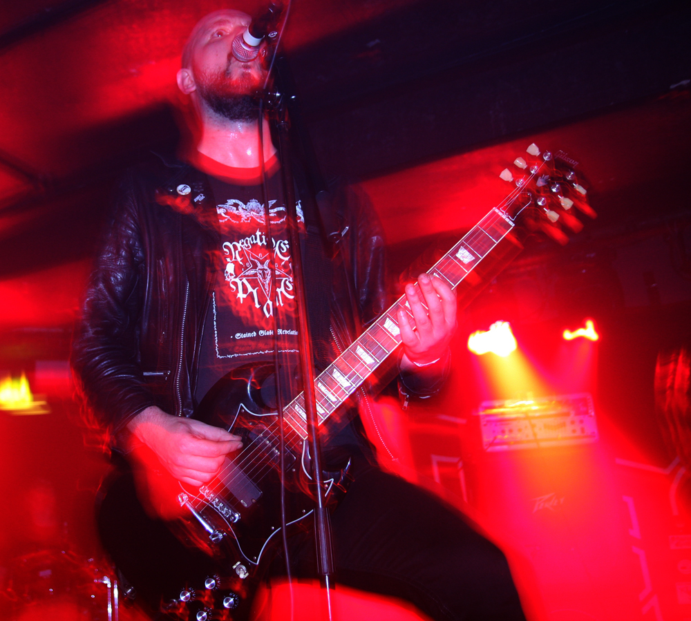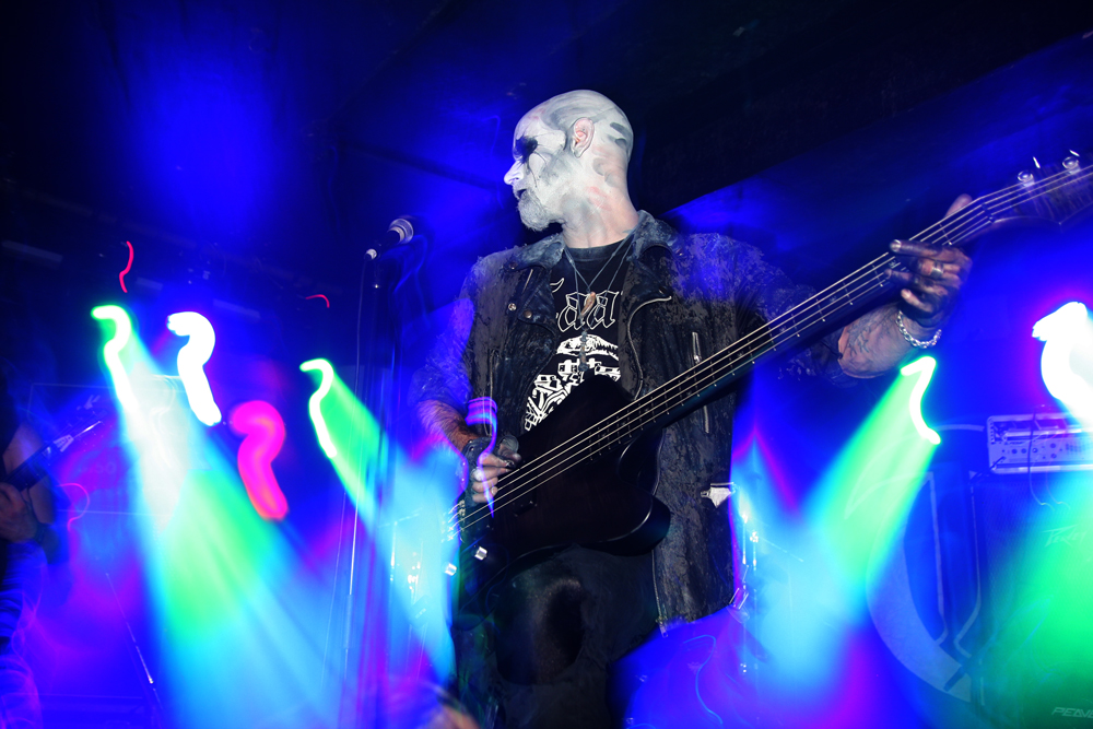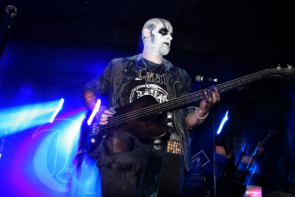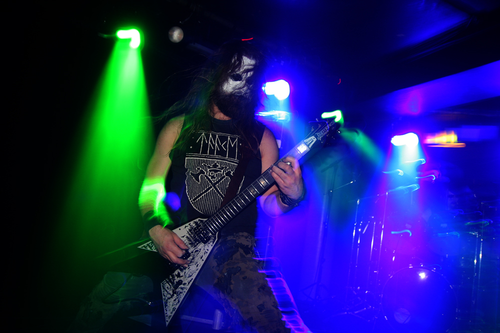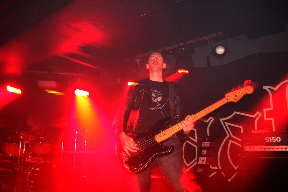Wode bring a completely different form of blackness down from Manchester and the quartet are also known to us via the shared duties of three of them in Aggressive Perfector. They come in all guns blazing and are fast, intense, thrashy and feral, displaying at times a bit of a wildcard core element to their sound. However, one describes them the reaction seems good and one has to wonder if after being stuck in traffic on this grim day has spurred them into this violent and cathartic on stage savagery. There’s some black gloved, classic stalking guitar lines and more than a touch of speed metal about things here reminding me that I did catch the aforementioned Aggressive P supporting Midnight earlier this year. The two bands do cross into same territories at time and are well lit on stage compared to earlier, the red lighting matching the anger perfectly. Had they brought some fans with them? Had there been ‘Fire On The Highway?’ The answer is possibly yes and the band are rewarded with a small but burly pit which had happily bruising away at each other. Wode also played a couple of new songs and although I had only just heard some of the old stuff prior to the show they certainly impressed and are definitely worth keeping an eye on.