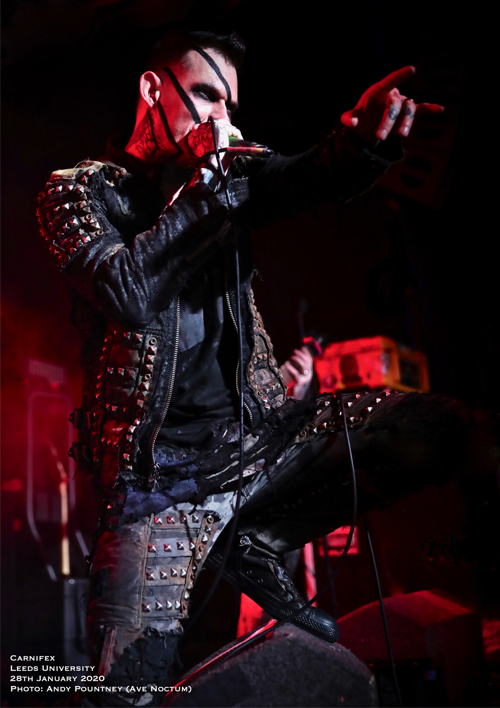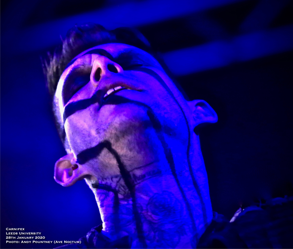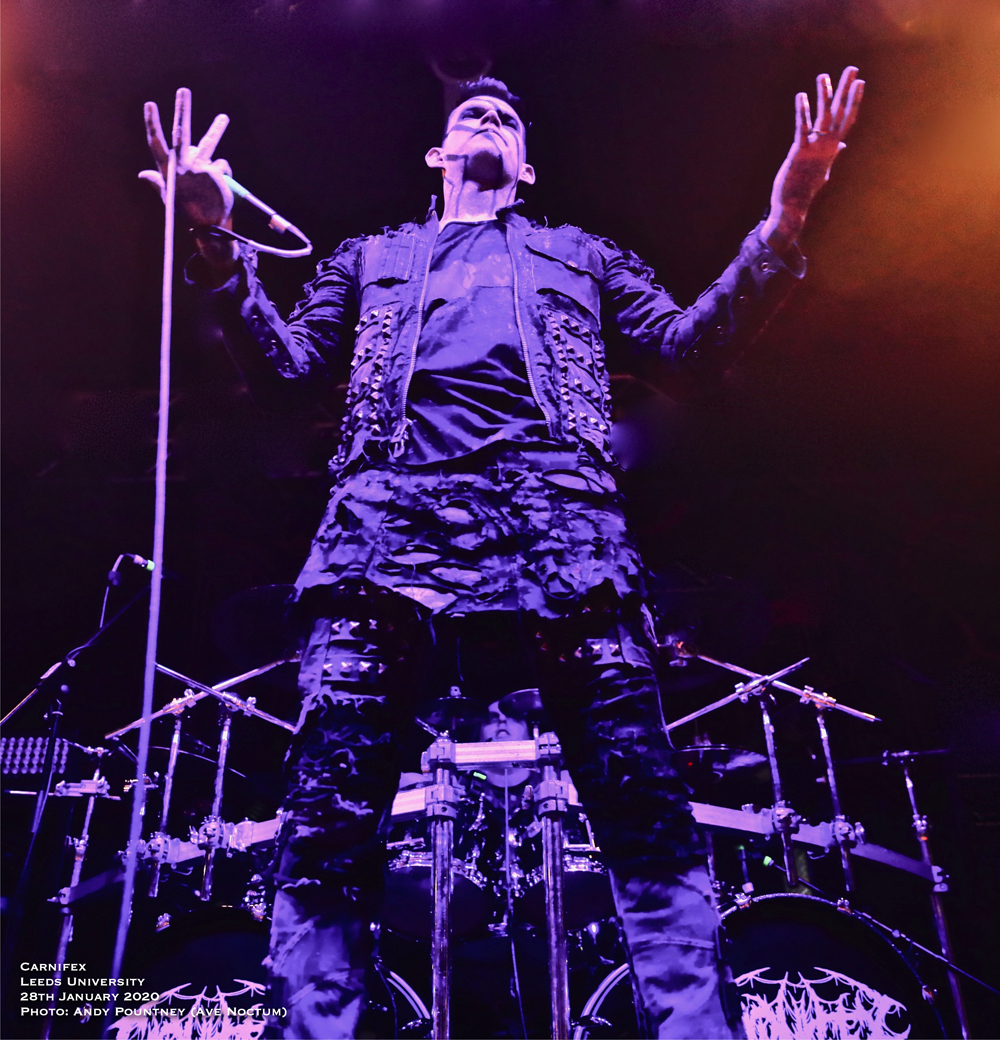 I’ve seen US tech deathcore act Carnifex a few times now and have been impressed by their unique take on the genre that incorporates a keyboard backing track, though I’d like to see a live keyboard player, plus a dramatic backdrop amidst their pummelling onslaught. Added to that their frontman is one of the most charismatic within the genre, adorned with black face stripes the band also had blackened eyes set to do sonic battle with the rabid audience that was now at ramming point on the main floor. With a short set to thunder through the band assaulted us with opener “World War X” whose bombarding drum work, complete with some stick twirling despite the speed, annihilated a good portion of the animated crowd.