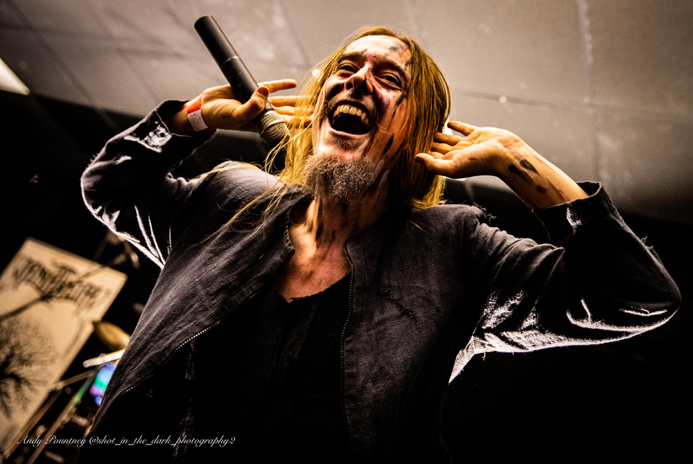 Now following that some bands might have had a little trouble but its Vanaheim time. To say the Netherlands band despite being only around since 2015 are beloved of the Warhorns regulars is putting it mildly. They could have come on wearing pineapple tea-cosies for hats and…oh wait one did. ‘Uit Steen Geslagen’ from their latest winds up and the flurry of ragged vocalist Zino and his eerie crew of epic folk metallers simply launch at the crowd. It’s like a wave crashing over us, drowning us in another time. The music is serious but the joy with which it is played is just wonderful to see. These people just want to play for us and nothing else.