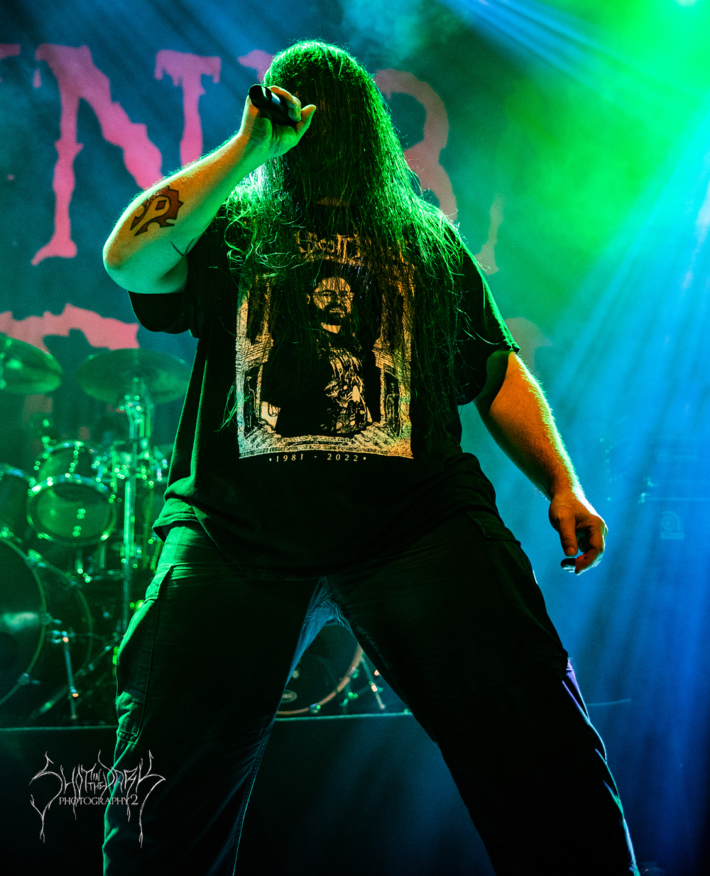 Corpsegrinder was in good spirits bantering with the crowd between songs, challenging them to keep up with him head banging (no change with that neck!) and dedicating ‘Fxxked With a Knife’ to the women in the crowd.