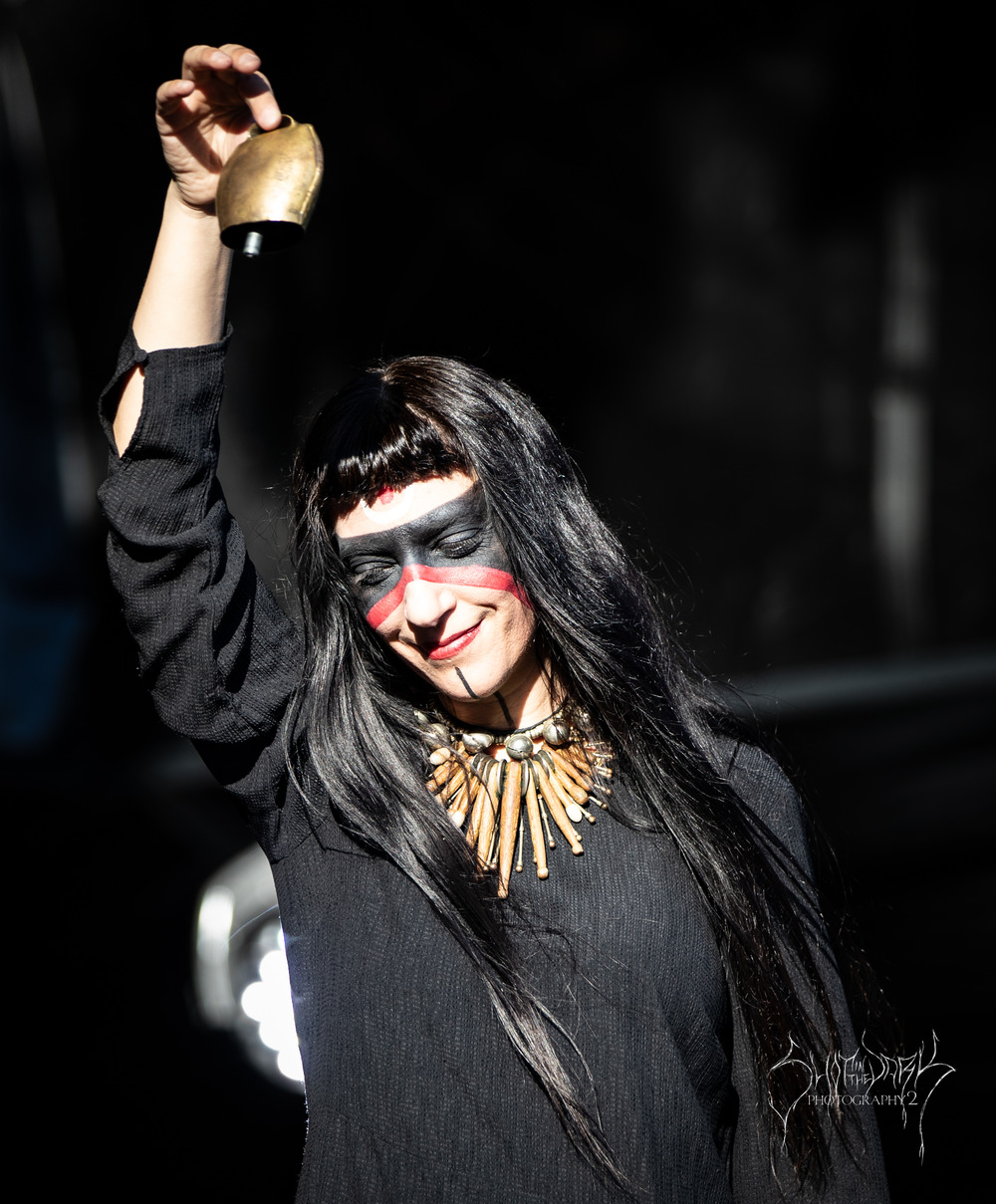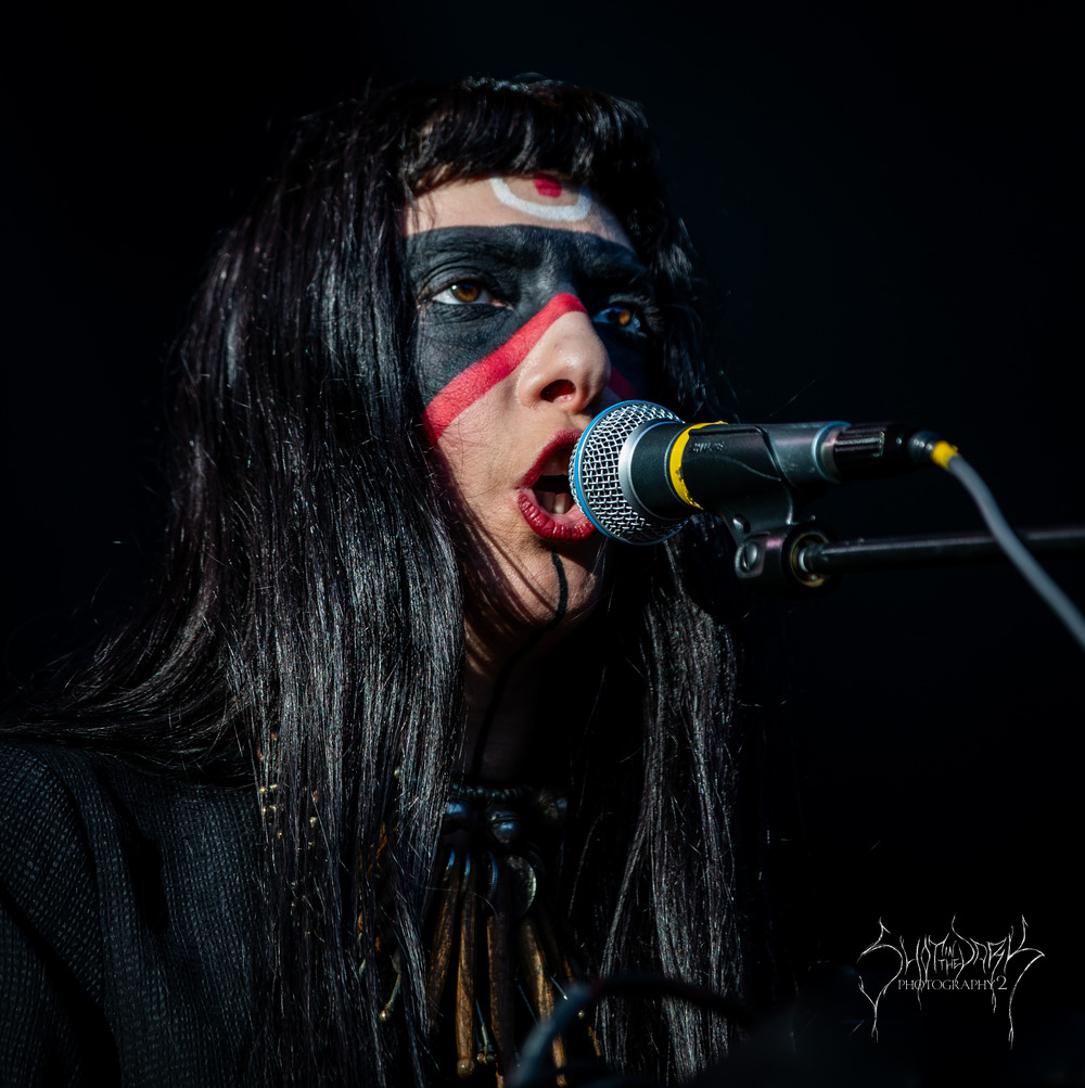 I had a quick wander around the merch area, before finding my spot for Lili Refrain and her intriguing, mesmerising soundscapes. Taking to the stage with her trademark black and red make up, she began by ringing hand bells and a cow bell, which were looped before upping the ante.