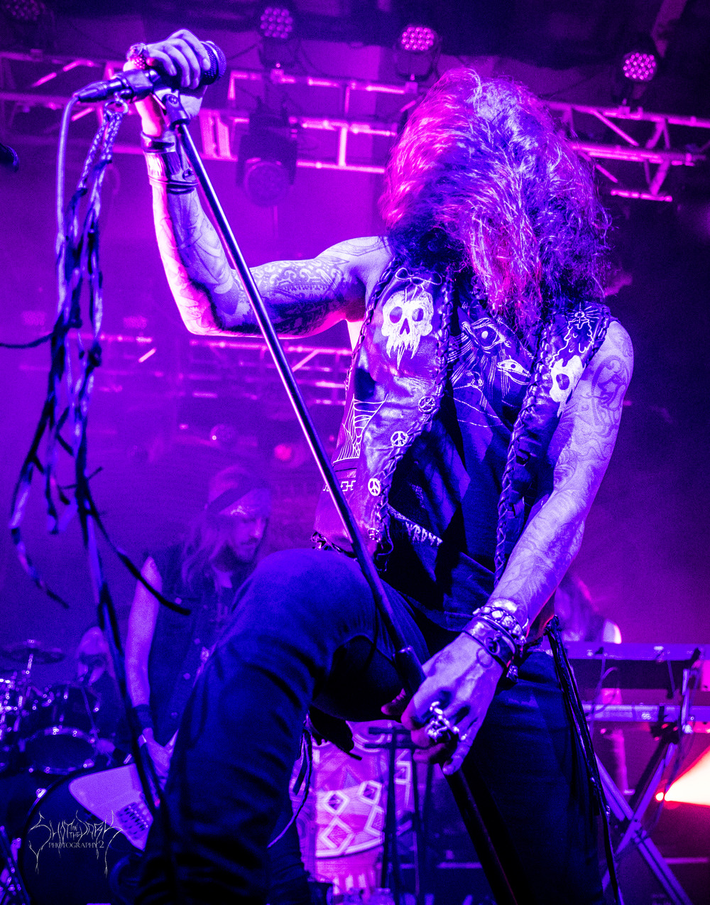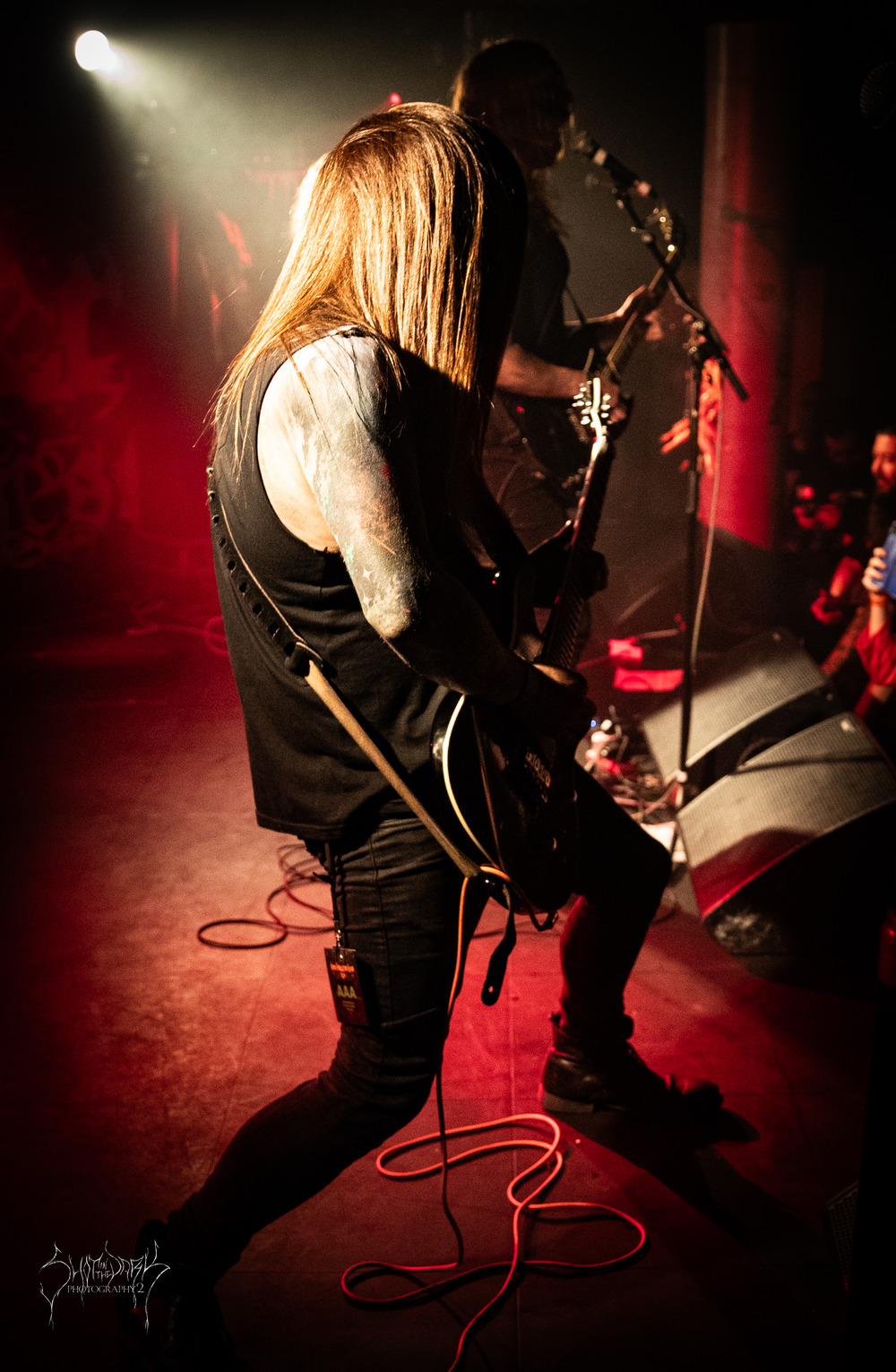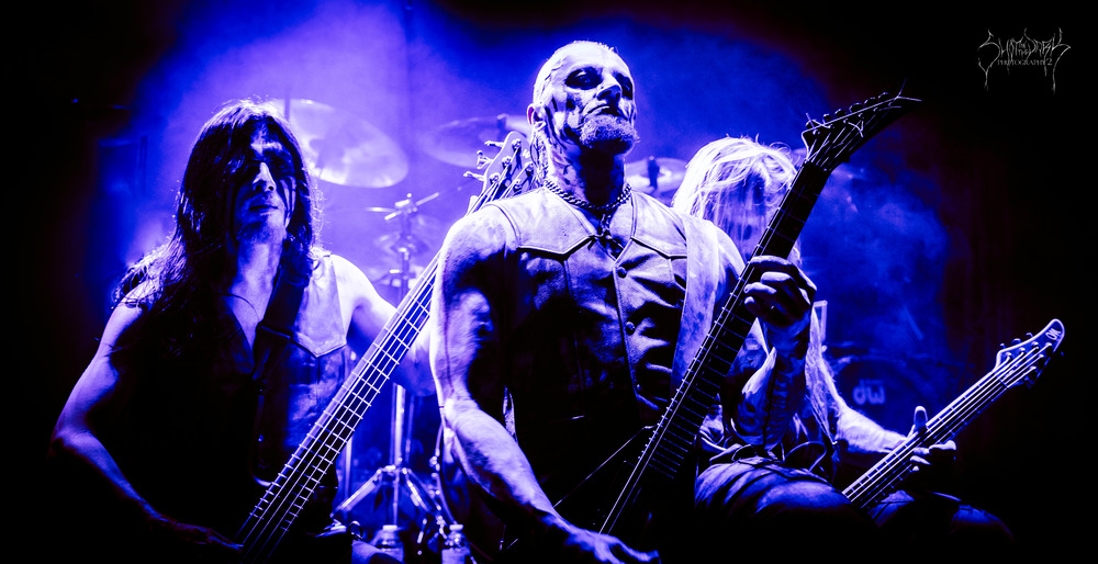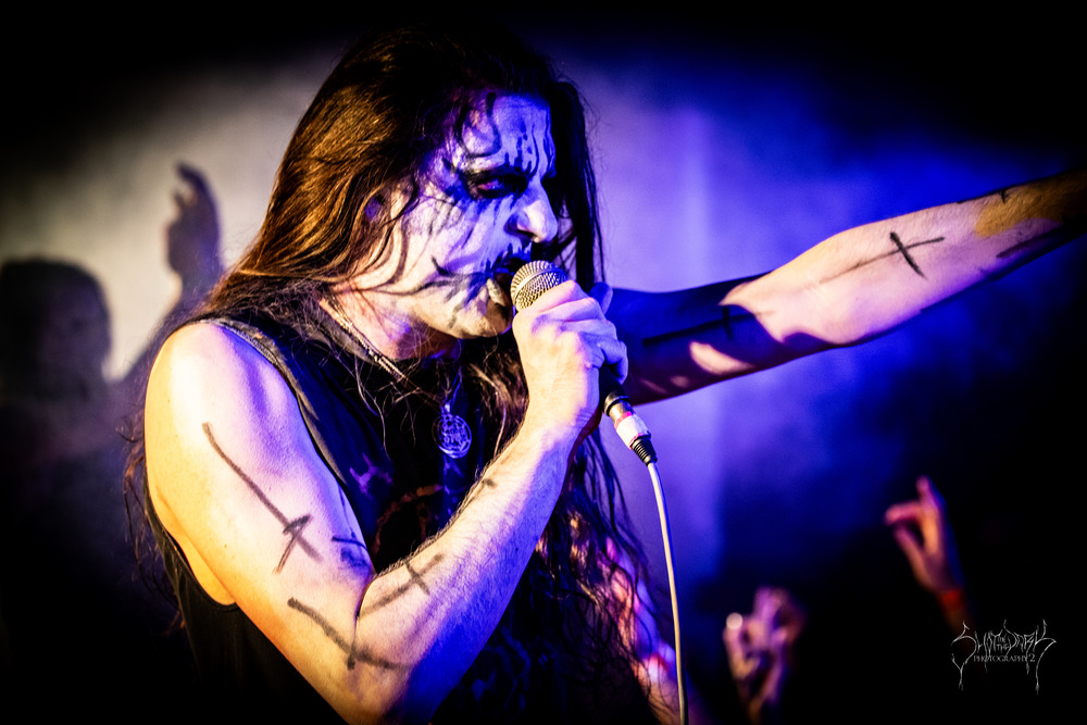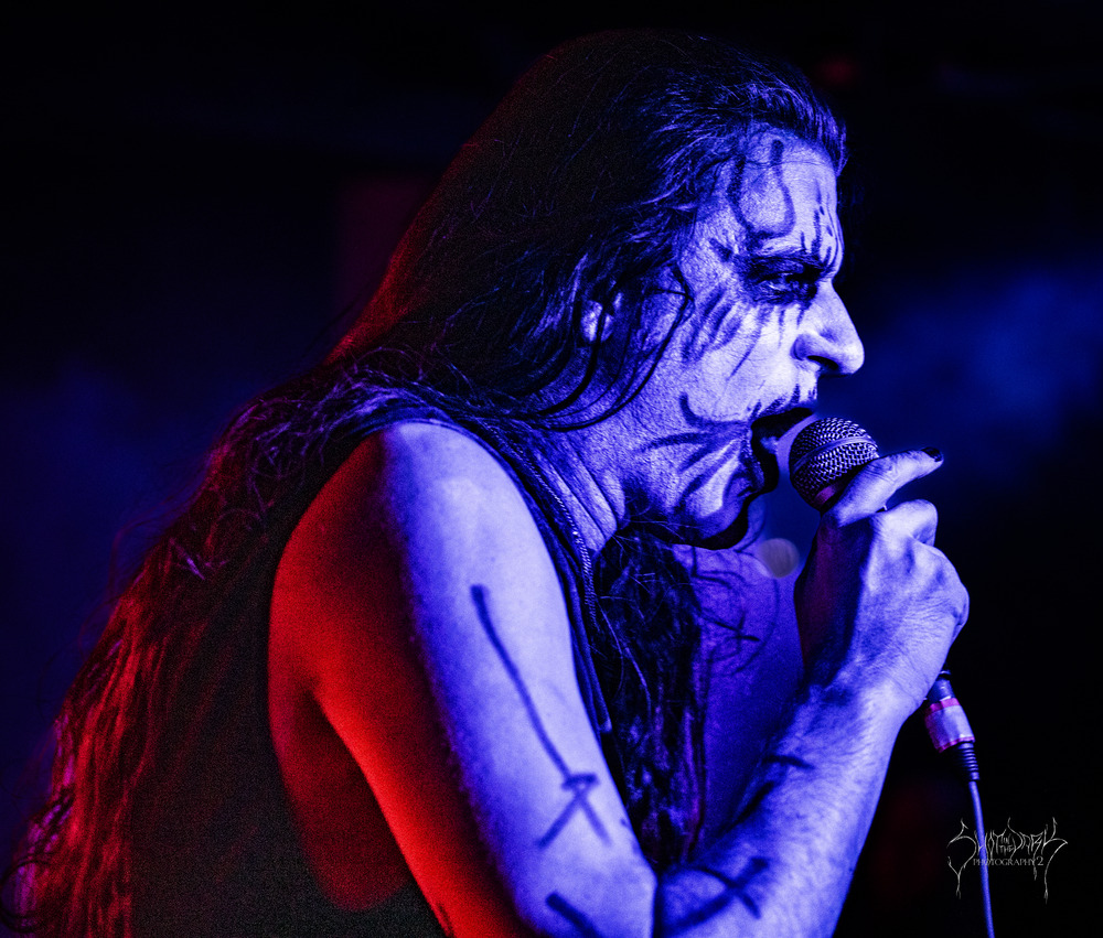 Talk about stumbling around in the dark and getting eyes and ears acclimatised to everything. The band are daubed in black wode too and gallop forth hitting their stride, primitive coarse vocals are punctuated by the occasional death belch. The front trio put on a co-ordinated display of hair twirling as the dark melodies come through and they spread their ‘Cold Tenebrous Evil.’