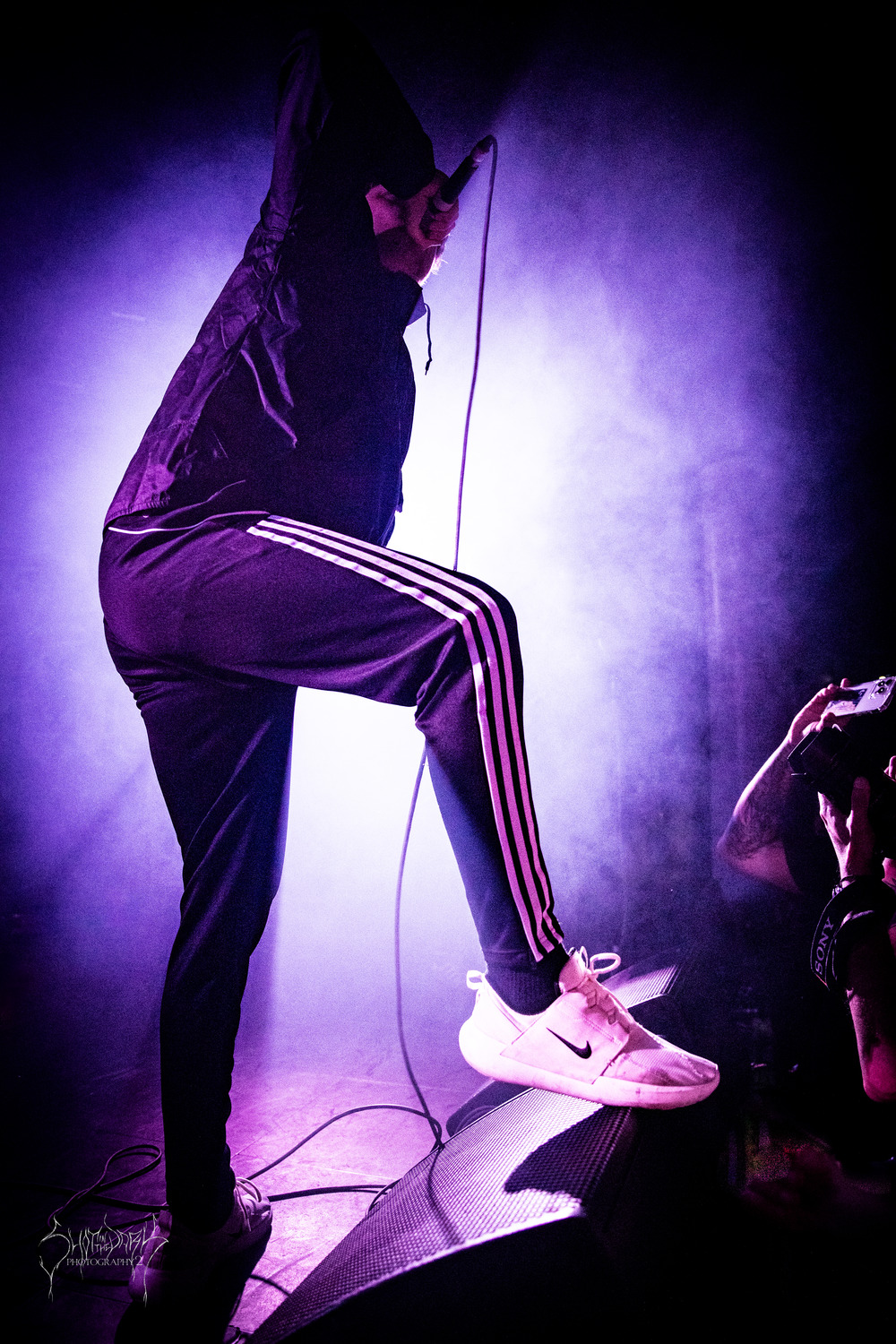 There’s another unexpected item in the baggage area or on the stage at the Underworld and he is wearing a track suit and having a fight with himself. With a name like Hexis one may think we were going to get a thrash band but nope this is hardcore, albeit it with a blackened edge.