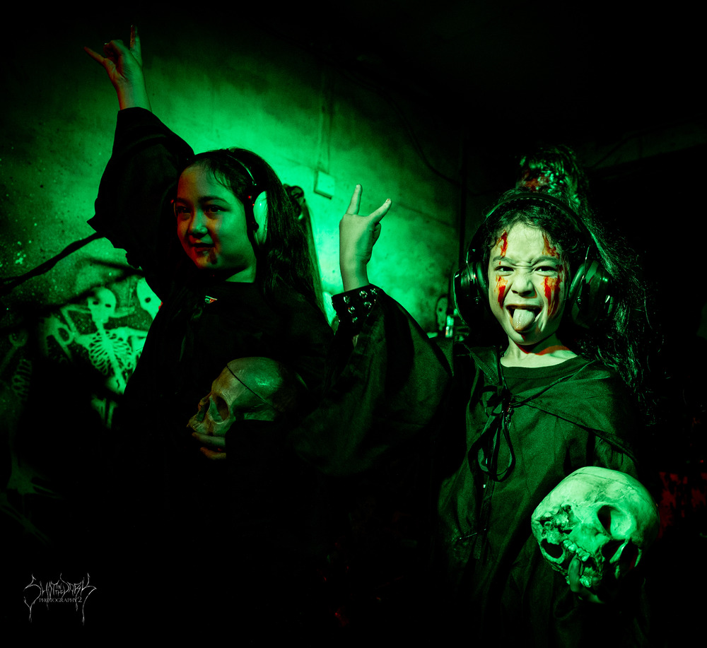 There were also two children on the stage (I suspect Dr. Mikannibal’s), wearing large ear defenders and a small amount of ‘blood’ on their faces. They provided some backing vocals and tentatively smiled and threw the horns at the crowd during the show.