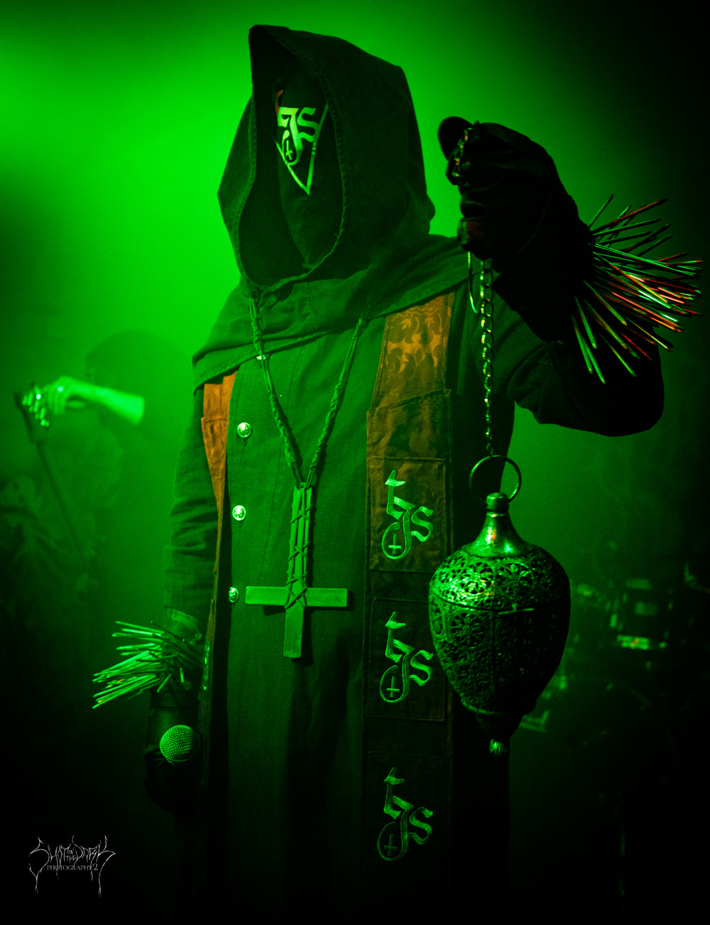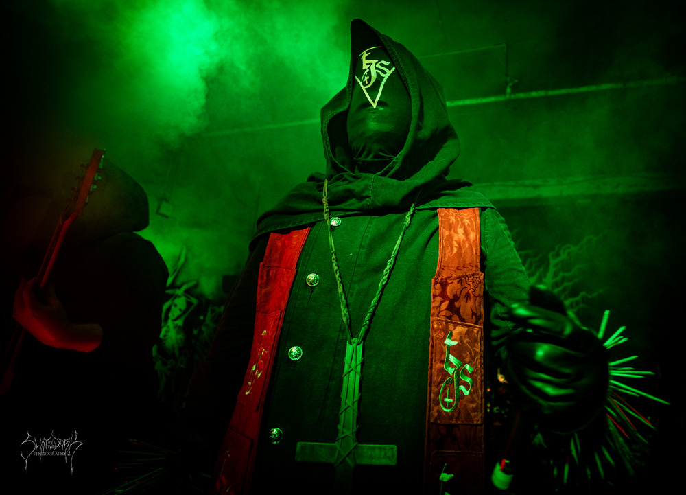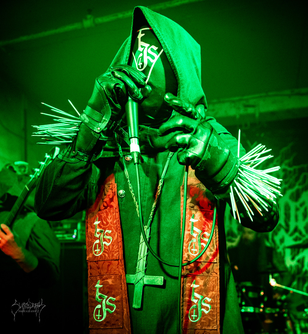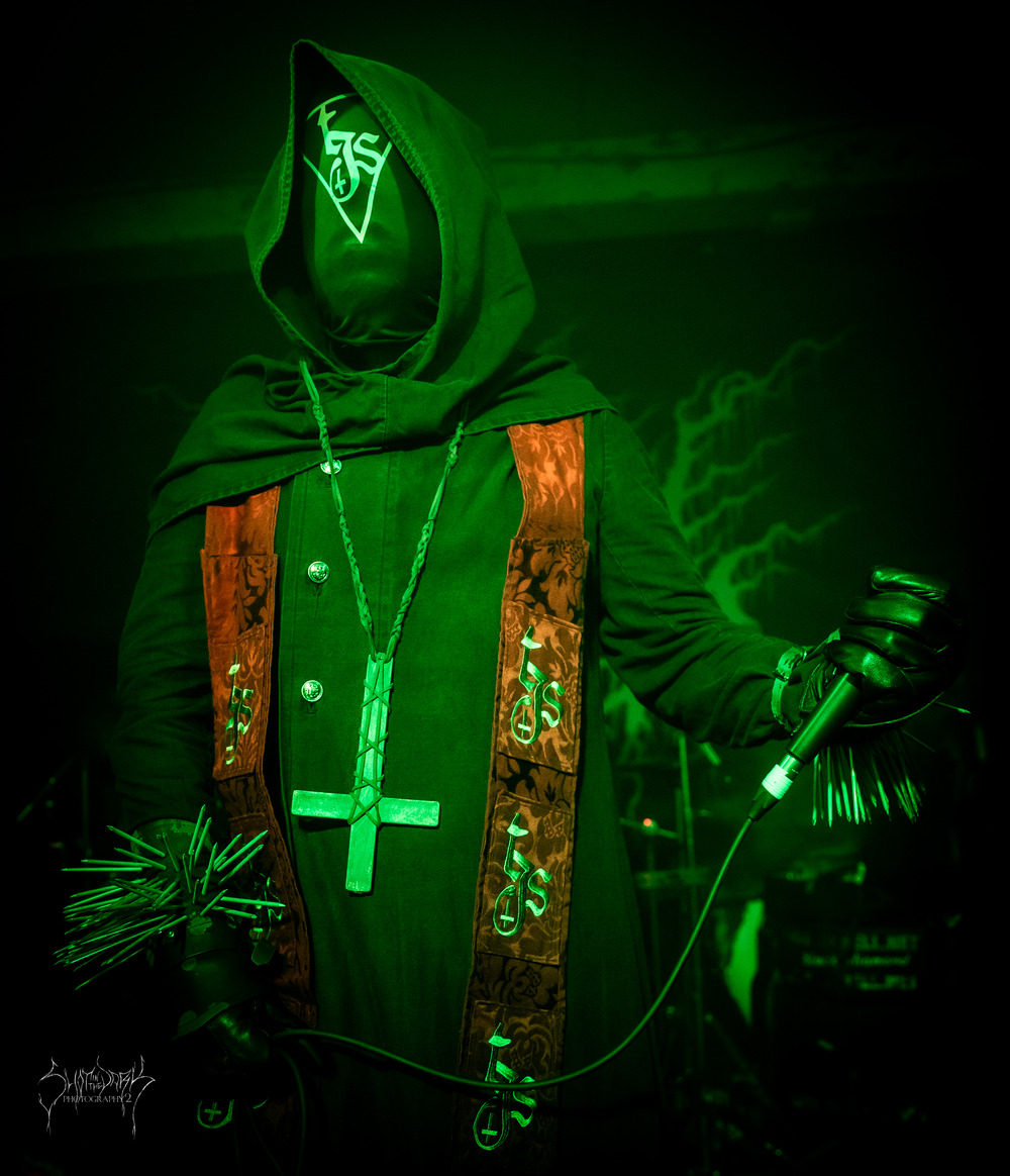 Before long, the band appeared and pushed their way through the packed crowd and took up their positions on stage. Decked out in their trademark masks and robes, and with the vocalist also sporting a red priest’s stole, emblazoned with The Infernal Sea logo, the band cut an imposing presence of stage.