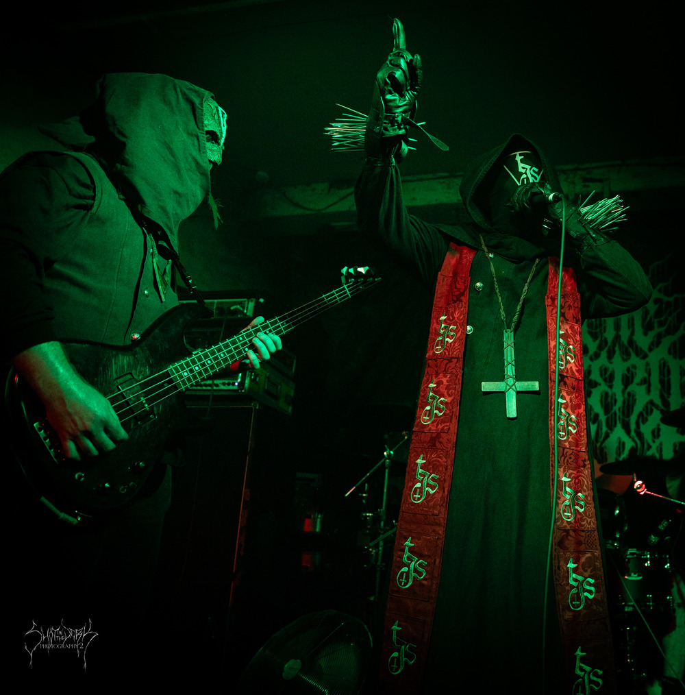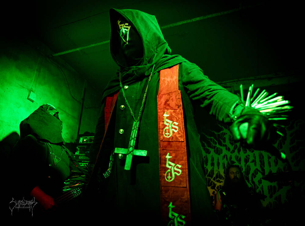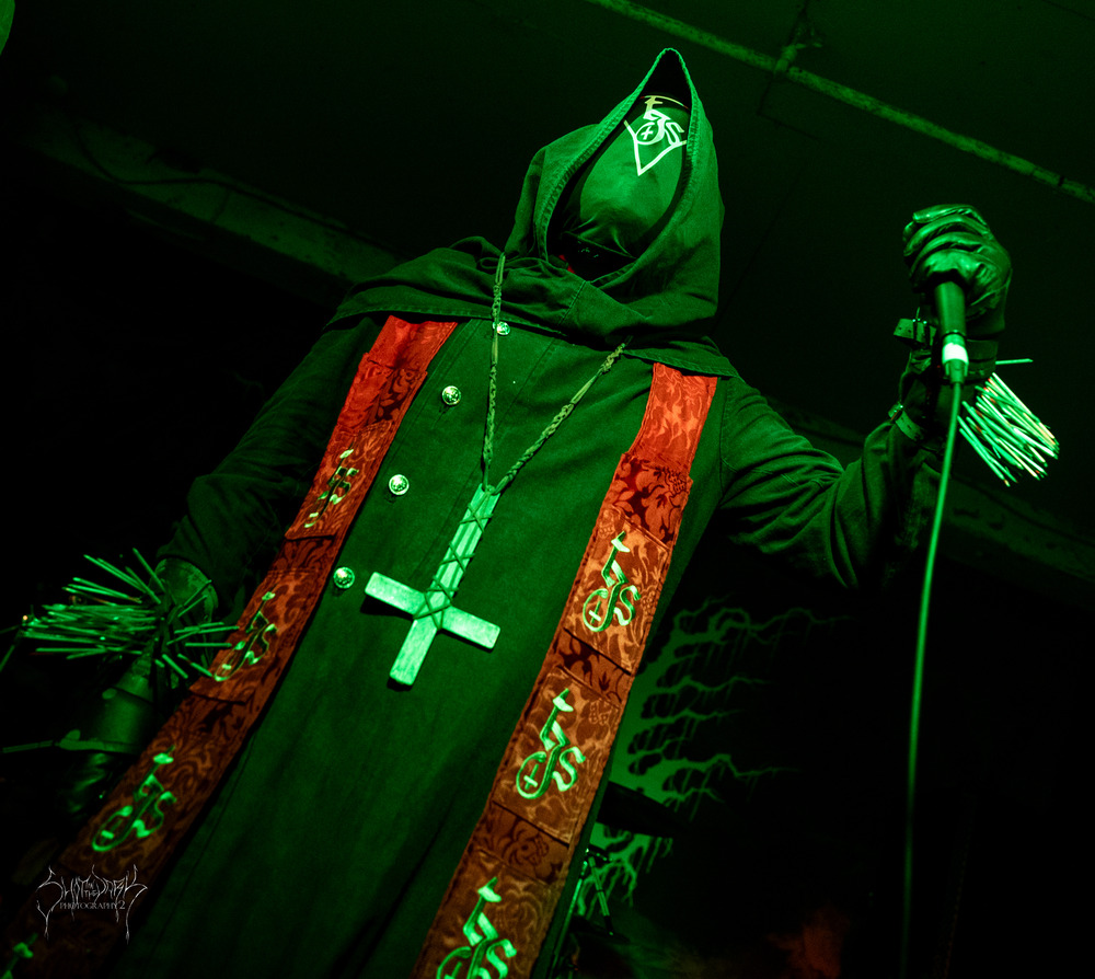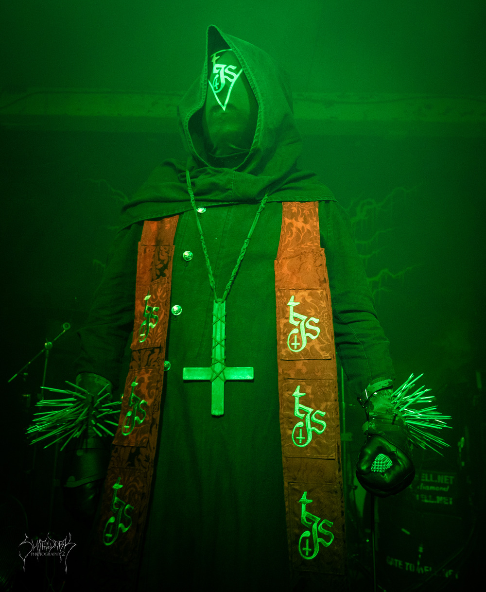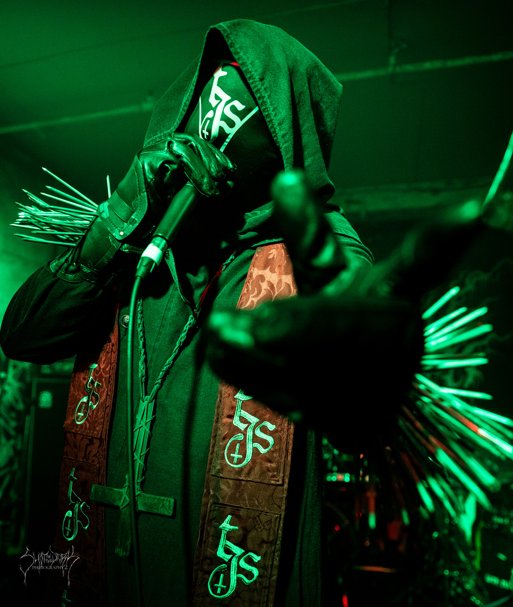 Before long, the band appeared and pushed their way through the packed crowd and took up their positions on stage. Decked out in their trademark masks and robes, and with the vocalist also sporting a red priest’s stole, emblazoned with The Infernal Sea logo, the band cut an imposing presence of stage.